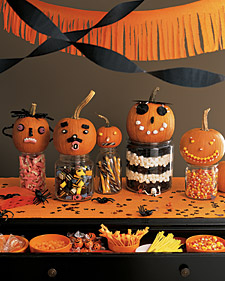 Fill vases and hurricanes with snacks on the table and illuminate the table with pumpkin lanterns. Sugar pumpkins are small and have only the slightest ribbing. Those with flat bases are best.