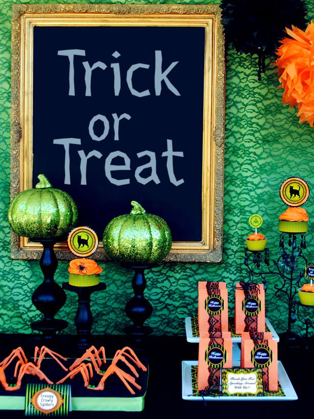 Put a spin on traditional Halloween colors with bright green and lace accents. Attach inexpensive lace to the wall for an over-the-top backdrop, and write Halloween messages on a framed chalkboard. Bring an elegant look to the table by placing cupcakes on black candelabras and adding sparkle with green sequins pumpkins. For an inexpensive, easy party favor idea, fill a bright orange bag with Halloween candy and embellish it with lace, a plastic spider and a sticker.