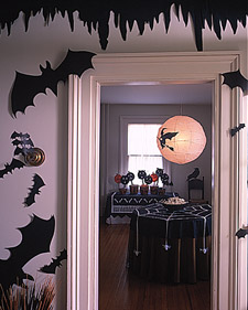Thrill Halloween party guests with a tablecloth covered in a ribbon spider web — complete with eerie painted white spiders. Adorn the rest of the room with card stock bats.