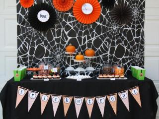 Carving pumpkins is one of the most interactive Halloween activities, so throw your own party filled with delicious treats and whimsical decor. Set a playful spider web tablecloth as the backdrop and enhanced it with inexpensive paper Halloween fans. Find all the edibles from the local supermarket and customize with party printables found on the web. Set the pumpkins on cake stands to make them the focal point of the table.