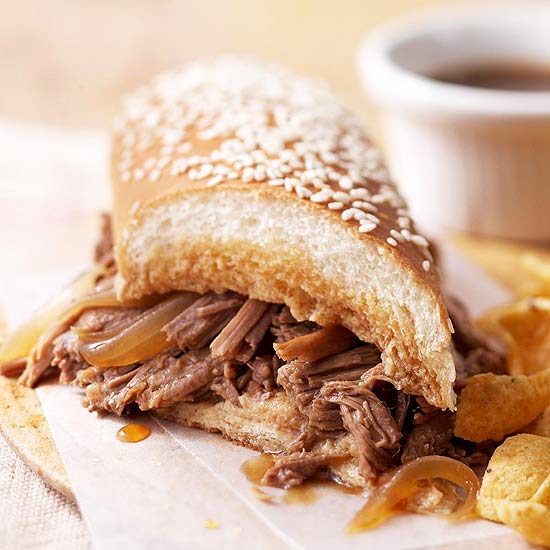 Directions:1. Trim fat from meat. In a large skillet, brown roast on all sides in hot oil; drain off fat.2. Place onions in a 5- to 6-quart slow cooker. Place meat on top of onions. In a bowl, whisk together broth, gravy mix, and pepper. Pour over meat in cooker.3. Cover; cook on low-heat setting for 10 to 11 hours or on high-heat setting for 5 to 5 1/2 hours. Transfer meat to a cutting board. Slice meat across the grain and return to cooker to keep warm. With a slotted spoon, remove meat and onions and serve on hoagie buns. Serve with bowls of cooking juices for dipping.