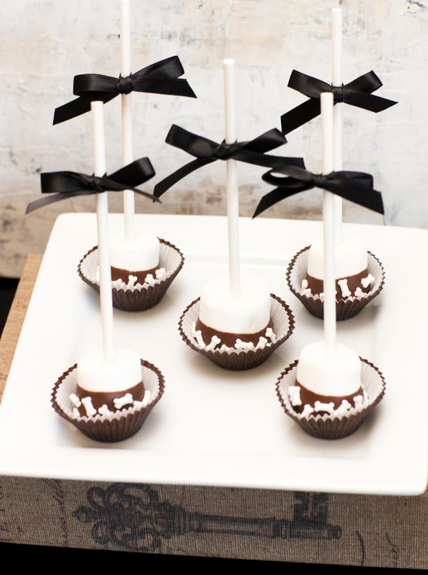 Mini candy bones give these marshmallow treats a crunchy texture kids love. To create them, skewer a regular-sized marshmallow onto a 6-inch lollipop stick. Dip into melted chocolate and, while the chocolate is still warm, roll in candy bones. For perfect presentation, display in small cupcake liners and top each stick with a little black bow.