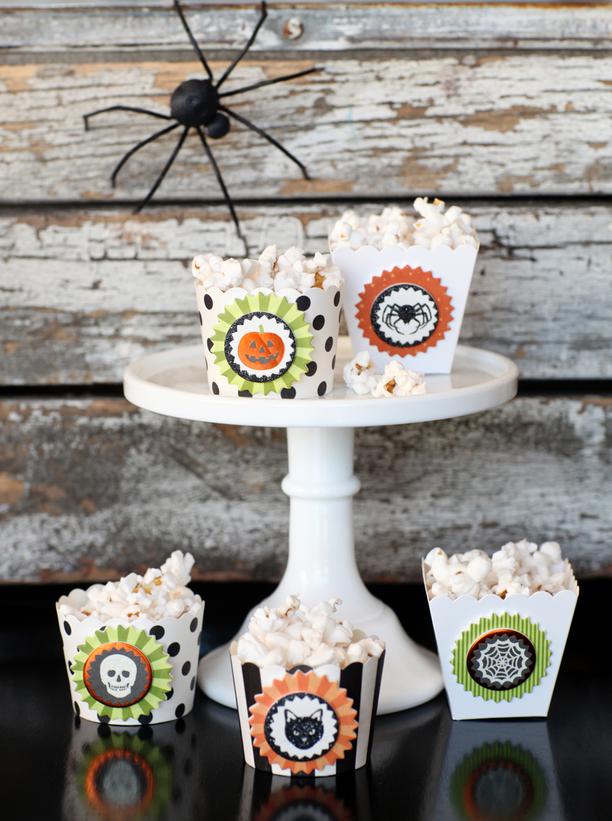 With so much candy around at Halloween parties, a salty snack will hit the spot. Whip up some homemade kettle-popped corn or one of our popcorn recipes below and place in scallop-edged cups. Embellish with dimensional scrapbooking stickers (found at craft stores) or one of our free printables. If you’re sending a cup home with your party guests, wrap it in cellophane and tie with ribbon so the popcorn will stay fresh.