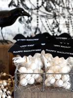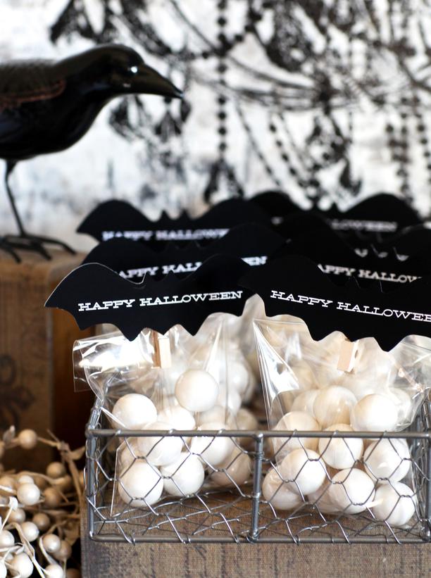 Mason jars are everywhere these days and they’re a great, affordable party favor. For Halloween, fill with white candy to make a ghost or orange candy to make a pumpkin. Top with a circle cut from our printable black-and-white striped paper and replace the lid. Use decals or stickers to create the ghost or pumpkin face. Tie on one of our printable tags with twine to complete the look.