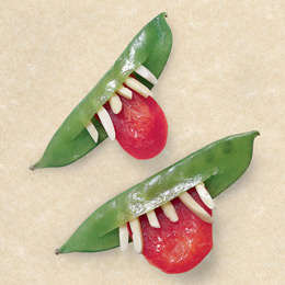 For each one, use the tip of a paring knife to cut a slit centered in one side of an edible pea pod (a parent’s job). Cut out a tongue shape from red bell pepper and insert the top of it through the opening in the pea pod (it looks best if the inside of the pepper faces up). For the finishing touch, insert a few slivered almonds for teeth.