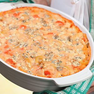 Preheat oven to 400 degrees F. Bring a Dutch oven of water to a boil. Cook noodles until barely tender, about 2 minutes less than package directions. Drain, rinse, and set aside.Heat oil in the pot over medium heat. Add carrots, celery, onion, and garlic and cook until beginning to soften, about 5 minutes. Add chicken and cook until no longer pink on the outside, 5 to 7 minutes. Whisk cornstarch and milk in a medium bowl; add to the pot along with salt. Bring to a boil over medium-high heat, stirring often, until bubbling and thick enough to coat the back of a spoon, about 4 minutes. Remove from the heat and stir in hot sauce. Spread the noodles in a 9-by-13-inch (or similar 3-quart) baking dish. Top with the chicken mixture; sprinkle with blue cheese.Bake the casserole until it is bubbling, about 30 minutes. Let stand for 10 minutes before serving.