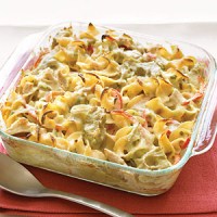 Preheat oven to 400 degrees. Lightly oil two 8-inch square (or other shallow 2-quart) baking dishes. In a large pot of boiling salted water, cook noodles until 2 minutes short of al dente; drain, and return to pot. Meanwhile, in a 5-quart Dutch oven or heavy pot, heat oil over medium. Add bell peppers; season with salt and pepper. Cook until crisp-tender, 4 to 6 minutes. Add flour and cook, stirring, 1 minute. Gradually add milk, stirring until smooth. Cook, stirring occasionally, until mixture comes to a simmer. Remove from heat; add mixture to noodles in pot, along with tuna, artichoke hearts, and scallions. Season with salt and pepper, and toss. Divide between prepared baking dishes, and sprinkle with Parmesan. Bake until golden and bubbling, about 20 minutes.