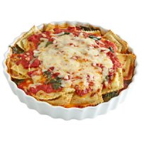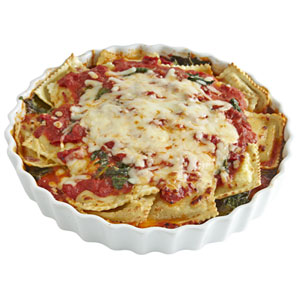 Heat oven to 425 degrees F. Put spinach in a colander in the sink. Mix marinara sauce and sun-dried tomatoes together in a large bowl. In a smaller bowl, combine mozzarella and Parmesan. Bring a large pot of salted water to a boil. Add ravioli and cook just until they float to the surface, 1 to 2 minutes. Drain ravioli over spinach to wilt. Add ravioli and spinach to marinara mixture. Lay down enough ravioli to cover the bottom of a 9- by 1 1/2-inch gratin dish (or bake in individual 4 1/2- to 5-inch gratin dishes). Sprinkle 1/3 of the cheese mixture on top. Repeat with remaining ravioli and cheese mixtures, finishing with the cheese on top. Bake until hot and bubbly throughout, 10 to 12 minutes.