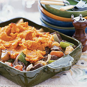 Position racks to divide oven in thirds. Heat to 325°F. Coat beef with flour. Heat oil in a Dutch oven over medium-high heat. Add beef and brown. Add broth, onion and garlic; bring to a boil. Cover tightly and place stew on one oven rack, potatoes on other rack. Bake 30 minutes. Cut carrots, parsnips and celery into 1-in. lengths; stir into stew. Cover and bake 45 minutes or until tender when pierced. Peel potatoes and mash with butter and salt. Bake and serve or cool, cover separately and refrigerate up to 3 days. To serve: Heat oven to 400°F. Skim fat off stew, then spoon into a shallow 3 1/2-qt baking dish; spread potatoes over top. Bake 50 minutes or until bubbly around edges and hot in center.