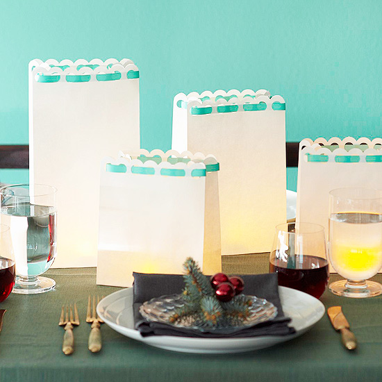 Transform plain white paper bags into luminarias for an inventive holiday centerpiece on the cheap. Use a large scalloped-edge punch to create the detail on the bags, then weave ribbon through the openings and secure with double-stick tape. Use battery-operated tea lights instead of candles for long-lasting, safe illumination.