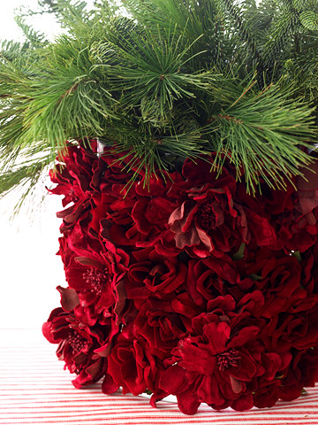 Make a vase filled with evergreens more stunning by covering it with fresh flowers. Remove the heads from roses or other seasonal flowers and then hot-glue them to a glass vase or other vessel.