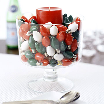 Let there be light! Tuck a candle into a bowl of Christmas bulbs. Look for the old-fashioned strand of bulbs. Then coordinate your holiday decor by mixing and matching the candle and bulb colors.