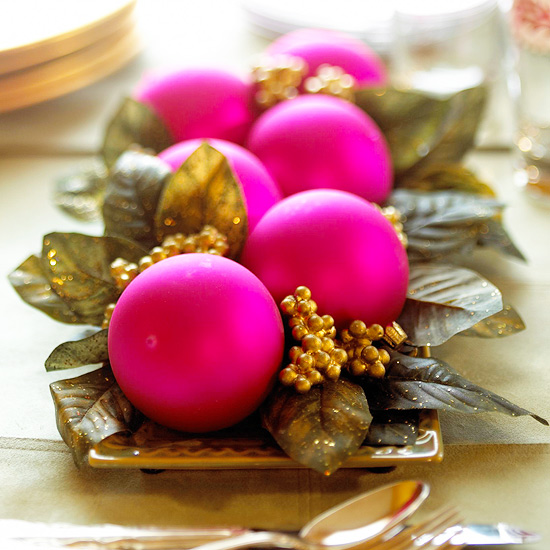 Real or artificial magnolia leaves (we gave ours a quick spritz of gold paint) are set on a flat platter to form the foundation for an arrangement of holiday ornaments and tiny berry sprigs. Easy and impressive!