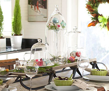 Elevate your centerpiece with a handsome vintage sled. Top with an assortment of cloches, ornaments, and greenery. After the holidays, keep the sled, but replace the Christmas-theme accents with winter wares, like white pillar candles in glass hurricanes surrounded by faux snow.