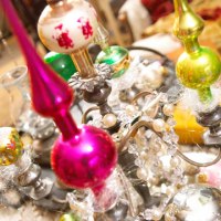Vintage tree toppers take center stage when grouped into an antique candleholder. Be sure to secure the toppers with temporary adhesive that won’t damage the ornament.