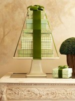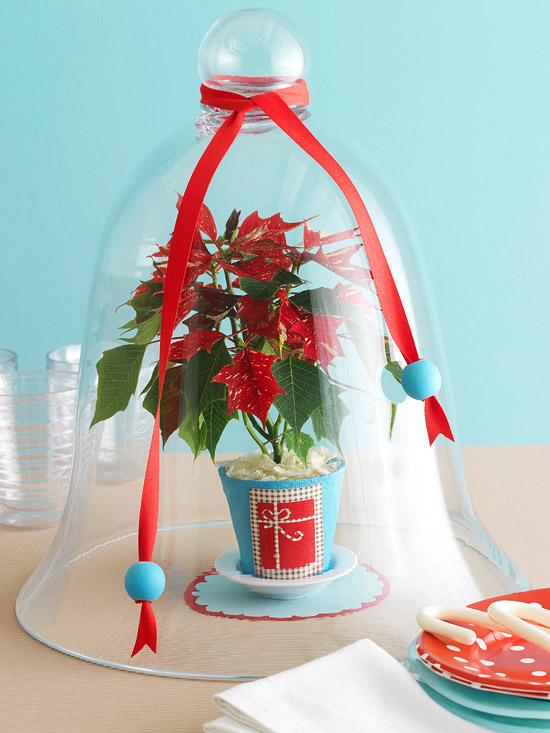 Accent Christmas red with a favorite color, such lime green or turquoise (as shown here), for a colorful holiday centerpiece. Paint a peat pot your desired color and let dry. Create a gift box design on coordinating scrapbook paper and glue to the front of the peat pot. Place a miniature poinsettia plant inside a plastic sandwich bag and place inside the peat pot. (You may need to remove extra soil from around the roots so it will fit in the pot.) Cover the top with shaved soap or purchased coconut for a fresh-snowfall effect. Place the pot in a small dish, beneath a cloche decked out in matching ribbon.