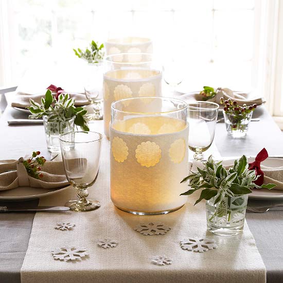 A holiday table is even cozier when layered in winter whites. To make the runner, cut 18-24-inch wide felt by the yard to the needed length. Trace halfway around a drinking glass at the ends of the runner to create scallops; cut out with scissors. Embellish with punched scalloped-edge circles. On smaller sections of felt, punch more scalloped-edge circles, and wrap felt around oversize glass vases. Insert candles for a soft, wintry white glow, and scatter felt snowflake cutouts across the table runner.