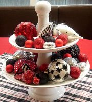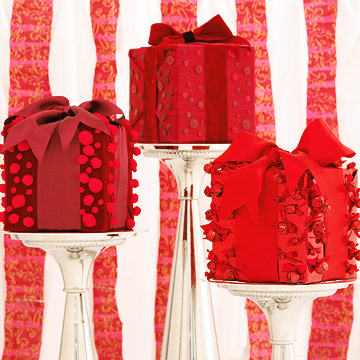 Stack monochromatic boxes, all in various patterns, on top of a footed cake plate for this centerpiece. Top the tower with a bow and a length of ribbon trailing down on each side. Secure the ends of the ribbon tails to the underside of the cake plate.