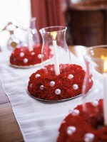 These three wreaths are easy to make with florist’s foam wreath bases, pearl ornaments, and scarlet carnations. Add glass hurricanes and ivory-color candles for classic Christmas centerpieces.