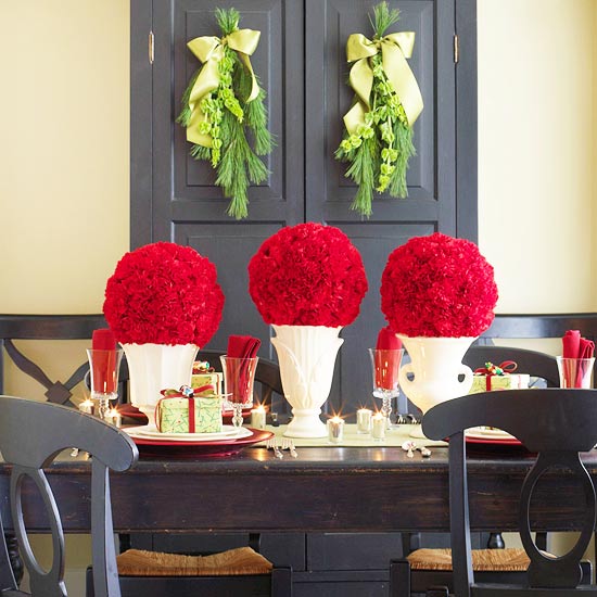 This tabletop take on pomander balls makes an eye-catching Christmas display. Simply soak florist’s foam balls in water and cover with red carnations. Place the finished balls atop white vases or urns placed in a row along the center of your table.