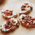 Directions: Preheat the oven to 400 degrees F. Arrange the baguette slices on a baking sheet and brush with olive oil. Bake for about 8 minutes, until toasted. Spread each toast with goat cheese and top with the peppers. Drizzle with oil, sprinkle with the chives and salt, and serve.
