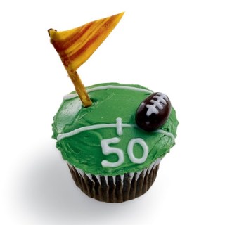 Frost a cooled cupcake (baked from your favorite recipe) with green frosting, then mark the yard lines with white decorators’ gel. For a pennant, wrap a fruit leather triangle around a pretzel stick and plant it in the field as shown.