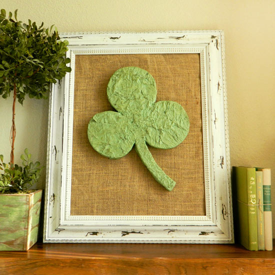 Add a touch of Irish-theme decor to your mantel with an easy-to-make framed clover. Trace a clover shape onto a 1-inch thick piece of plastic foam; cut out. Cover the shape completely with crinkled tissue paper to add texture. Spray-paint the clover green, let dry, and apply an antique glaze to highlight the textured areas. Secure it to a framed piece of burlap with a bit of hot glue.