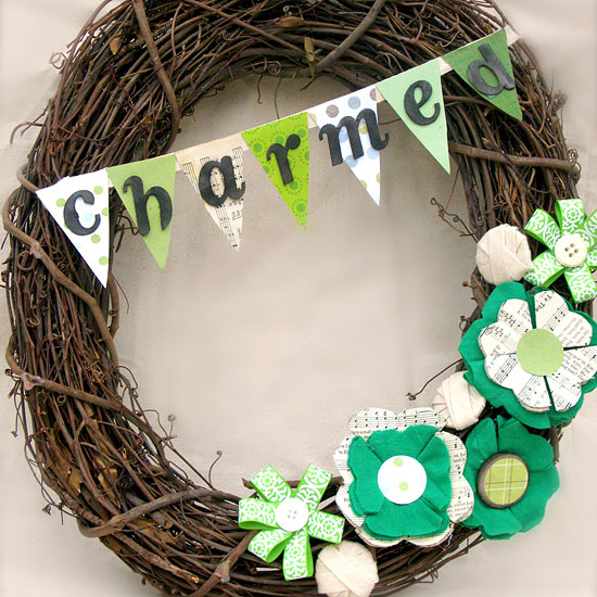 Turn a simple grapevine wreath from plain to charming just in time for St. Patrick’s Day. Embellish the wreath with crafty clovers made from an old green t-shirt, sheet music, and scrapbook paper. To make the clovers, cut heart shapes from your green fabric and patterned paper, then glue together for a layered effect. Wrap twill ribbon around wooden discs and glue buttons to folded green printed ribbon for a few smaller accents. Hot-glue everything to the wreath, including a pennant banner made from scrapbook paper and chipboard letters.