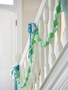 Dress up a staircase, mantel, or table with an Easter egg garland. Blow out about three dozen eggs, leaving holes on both ends. Dye the eggs the color of your choice, and use a bead-making needle threaded with stretchable jewelry cord or a narrow ribbon to connect the eggs.