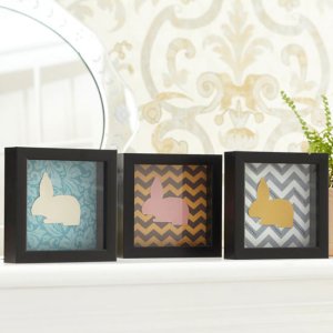 Hop into Easter decorating with these oh-so-easy framed bunnies. All you need is 6-inch-square window boxes, fabric, scrapbook paper, and our bunny pattern. Trace the pattern onto various colors of paper; cut out. Use adhesive to secure cutouts to 6-inch squares of patterned fabric, and set the fabric squares in each window box.