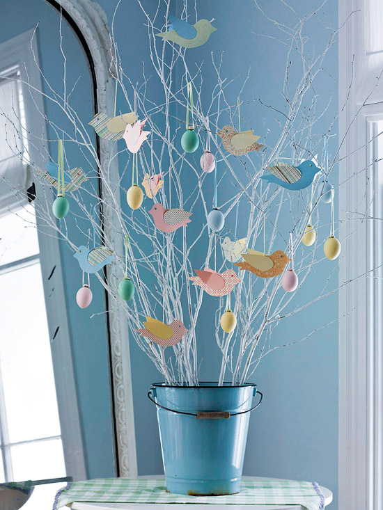 A simple Easter tree is made even cuter when it’s propped inside a blue pail. To make the decoration, gather branches and spray-paint white; after drying, place inside a pail and arrange branches to stay put with foam. Add stones, glass pebbles, or the like to decorate and weigh down the container. Hang blown-out egg ornaments and homemade crafts (such as our birds) to decorate this Easter favorite.