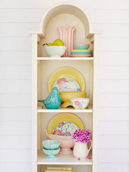 Easter decorating can be as simple as arranging pastel or flower-print china on a bookcase. Add a bowl of fruit or a vase of flowers for extra springtime cheer.