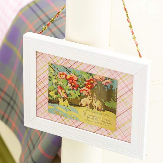 Turn a simple postcard into seasonally sweet artwork. Look for vintage Easter postcards at flea markets or find reproductions at bookstores. Adhere them to decorative paper, then frame. Attach a ribbon or string of beads to hang with style.
