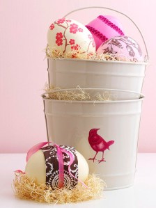 Who said only baskets can hold eggs? These adorable Easter pails also get the job done and are just as easy. Stamp, paint, draw, or use stickers to add a festive design to pails. Next, simply fill with Easter grass and add decorative eggs. To make eggs like those pictured, cut designs from decorative paper and adhere to eggs with decoupage medium.
