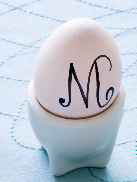 Create a place setting that’s undeniably Easter with a paper-strip nest. Take a myriad of colored scrapbook papers and shred them into tiny strips (a paper shredder works best). Form the paper strips into a ball large enough to fit an egg. Place an egg in the center of each ball, forming the strips into a nest around the egg. Let each guest know where they’re sitting with a pretty monogram sticker.