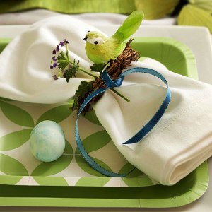 Evoke the first signs of spring on your Easter table with this place setting. We chose a set of pretty green paper plates for the base for our place setting and topped with a dyed egg and plain cloth napkin. The star of the show is the napkin ring ~ a small twig wreath wrapped with blue ribbon and adorned with a fresh-cut flower and a faux bird.