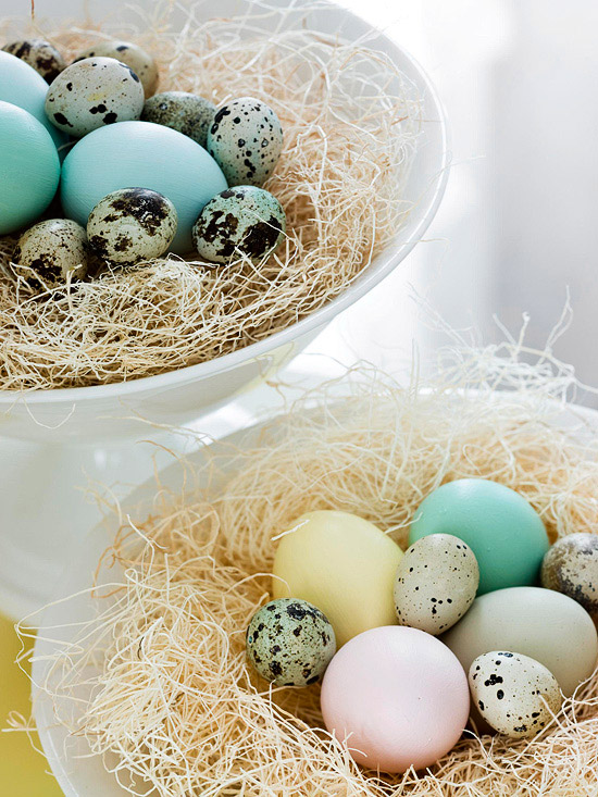 Create a beautiful Easter centerpiece in minutes with a footed bowl filled with Easter grass, dyed eggs, and egg-shape candy. The centerpiece will give your dining table a soft spring look.
