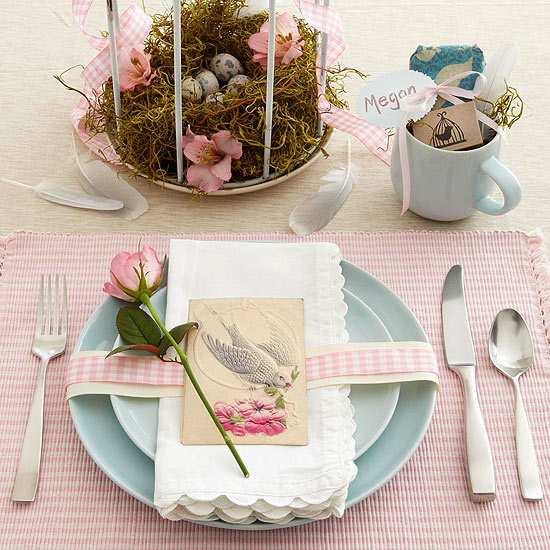 In place of traditional bunnies, try a stylish bird theme for your Easter table. Light blue plates complement pink gingham place mats; break up the color palate with lacy-edge white napkins. A nest of dried moss inside a birdcage becomes an easy centerpiece — accent it with pink blossoms (in florist’s water picks) and pink gingham ribbon to match the place setting.