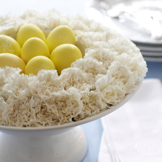 Turn a handful of dyed eggs and a few bunches of carnations into a pretty Easter centerpiece. Fill a medium-size footed bowl with a few inches of water. Next, nestle dyed eggs in a smaller bowl and set in the center of the footed bowl. Cut carnation stems about 2 or 3 inches long and pack the blooms around the bowl of eggs.