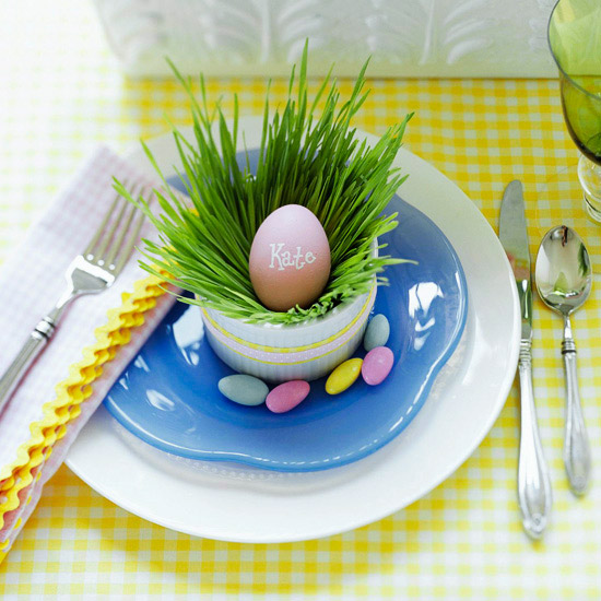 This fun Easter place setting incorporates everything spring: pastel colors on the egg name card, Easter candy, and artificial grass. Put everything on a bright blue plate and pair with a rickrack-edged napkin on top of a yellow gingham tablecloth to complete the look.