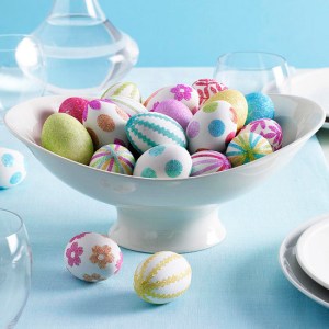 Bring Easter to your table with this dazzling flower-and-egg centerpiece. Place a clear drinking glass or thin vase in the center of a large-mouth jar or canister, and stack eggs between the glass and the jar. Fill the glass with water and arrange flowers (we used roses, gerbera daisies, tulips, hyacinth, and bells of Ireland).