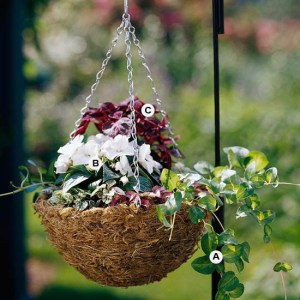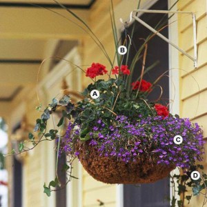 Create a “wow” moment by using colors that are opposite each other on the color wheel. Here, for example, rich purple makes a stunning contrast to golden-chartreuse. This basket does best in full sun. By the way: This container looks as good as it smells; heliotrope is one of the most fragrant flowers you can use in hanging baskets.