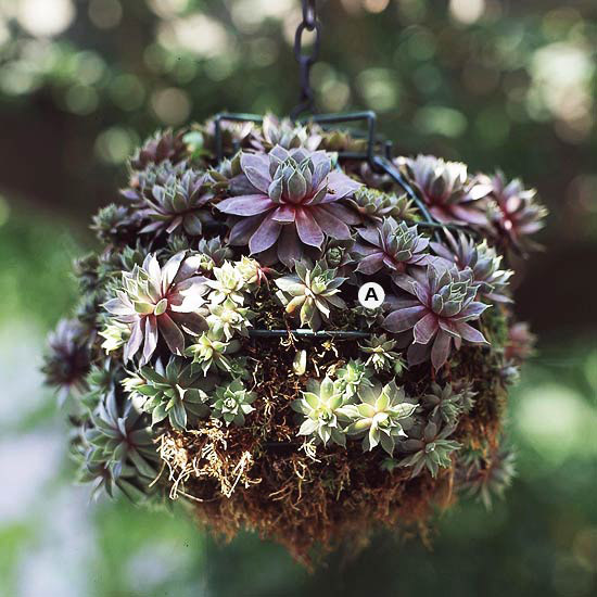 Create a virtually no-care container with succulents. We’ve found the biggest challenge of growing beautiful hanging baskets is keeping them from drying out. You can make maintenance a breeze with a planting of drought-tolerant hens and chicks, echeveria, sedum, or other succulents. They’re an unusual choice, but require next to no watering, even in hot, sunny situations.
