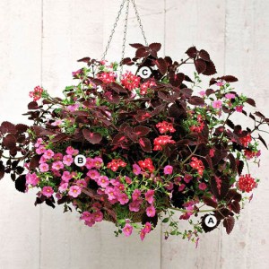 Create drama in your landscape with a container that mixes several shades of your favorite color. Here, hues of pink fill out and trail down the sides of this hanging basket. We love the inclusion of the coleus; its deeply colored foliage adds beautiful depth to the planting. Grow this beautiful basket in a spot with full sun.