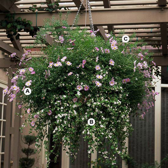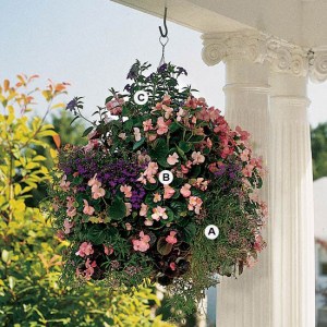 If bold, traffic-stopping colors aren’t for you, put together a basket full of elegance with soft, pastel colors. (Soft shades of pink, lavender, and blue are especially useful for helping hot, exposed spots seem a bit cooler.) Here, trailing plants, such as verbena create a soft, beautiful display perfect for gardens of any style — from cottage to formal. This basket is best in full sun.