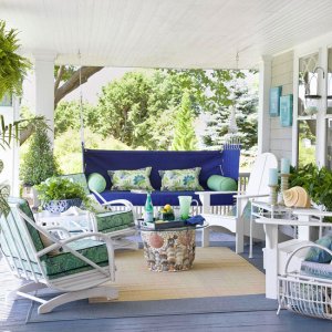 If you’re lucky enough to have a sizable front porch, use it to create a simple but inviting outdoor room. Group a comfortable bench and chairs to create a conversation nook. Keep the porch clutter free and open to cozy gatherings.
