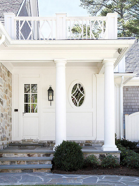 A lot of homes are fitted with inexpensive aluminum screen doors that hide an attractive entry door. Newer storm-door designs offer larger glass panels, sturdier frames, and more color choices. If you don’t have a storm door, paint the entry door with an accent paint color or clear varnish on wood.