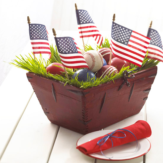 You can pull together this patriotic decoration in a jiff. Just fill an open chest or basket with decorative green grass, baseballs, and red and blue croquet balls. Top it off with a few tiny flags.