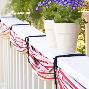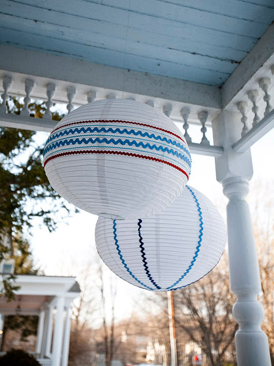 Illuminate the outdoors with these festive porch decorations. Simply glue assorted blue and red ribbon and rick rack on plain white lanterns available at your local home decor store.