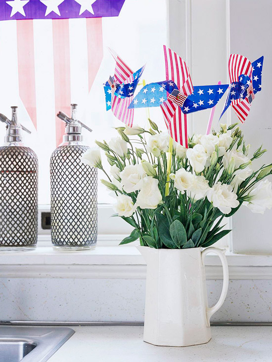 Give a handful of plain white blooms a patriotic attitude by poking in some stars-and-stripes pinwheels.